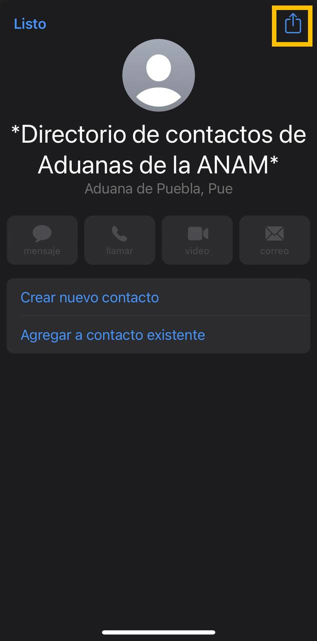 6. Abrirá una pantalla de contacto, tendrás que dar clic en el botón con la flecha apuntando hacia arriba