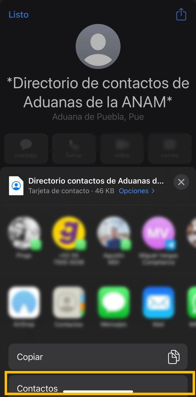 8. Se desplegará una ventana con las opciones para compartir, tendrás que dar clic en "Contactos" ubicado en la parte inferior de tu pantalla.